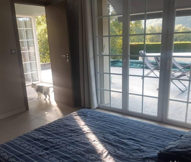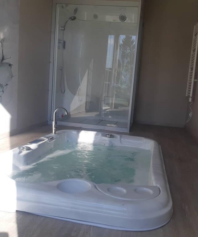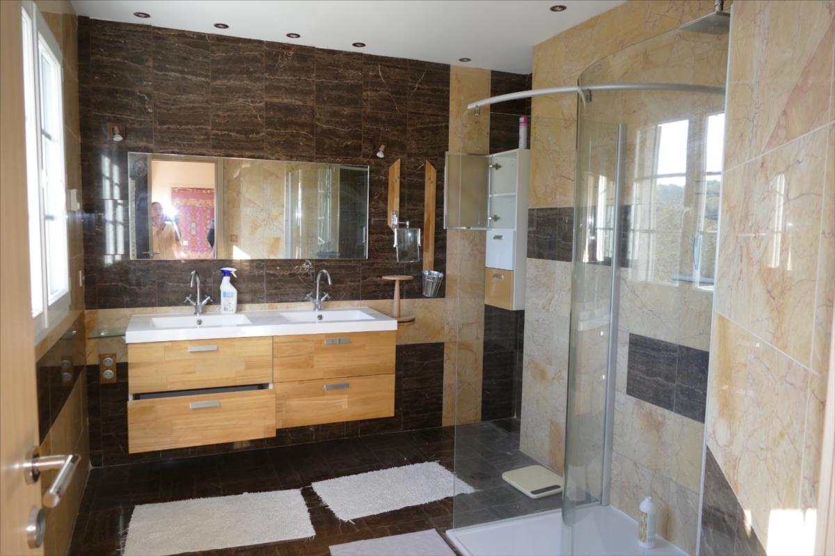 Accessible de pl.pied côté NORD, elle vous offre un hall d'entrée avec placards, une cuisine meublée et équipée avec coin repas, une salle à manger avec placards. Côté SUD , un jacuzzi et son hammam, un salon avec poêle à bois, un bureau avec placards, une chambre avec sa salle d'eau privative, un WC avec lave-mains .Toutes les pièces côté SUD donne accès à une terrasse de 125m².